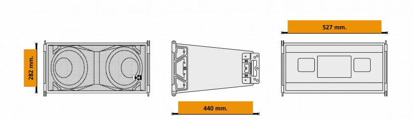 The cabinet is constructed entirely of 15 mm birch plywood finished with high-impact, chip-resistant paint. The coupling hardware is fully incorporated, and is made of aircraft-grade, nickel-chromium-molybdenum steel. The splay angle from one element to another is adjustable from 0° to 12°. The light weight of the enclosure and the clever system of coupling and splay angle adjustment permit the assembly of arrays with only two hands available.
