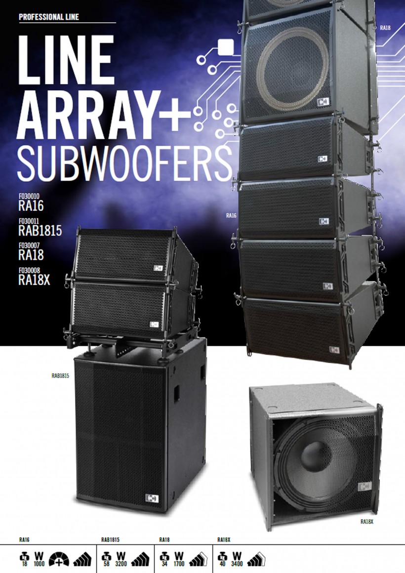 An array of four RA16s exhibits precise 120° horizontal dispersion with a frequency response of 70 Hz ÷ 20 kHz (±3 dB).