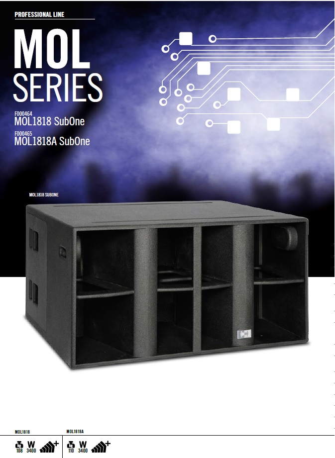 The unusually low distortion and the unexpected long throw of model MOL1818A when compared with subwoofers having the same size and power rating makes it possible to achieve very high levels of performance from a smaller number of units. Particular attention has been focused on efficiency and tonal neutrality.