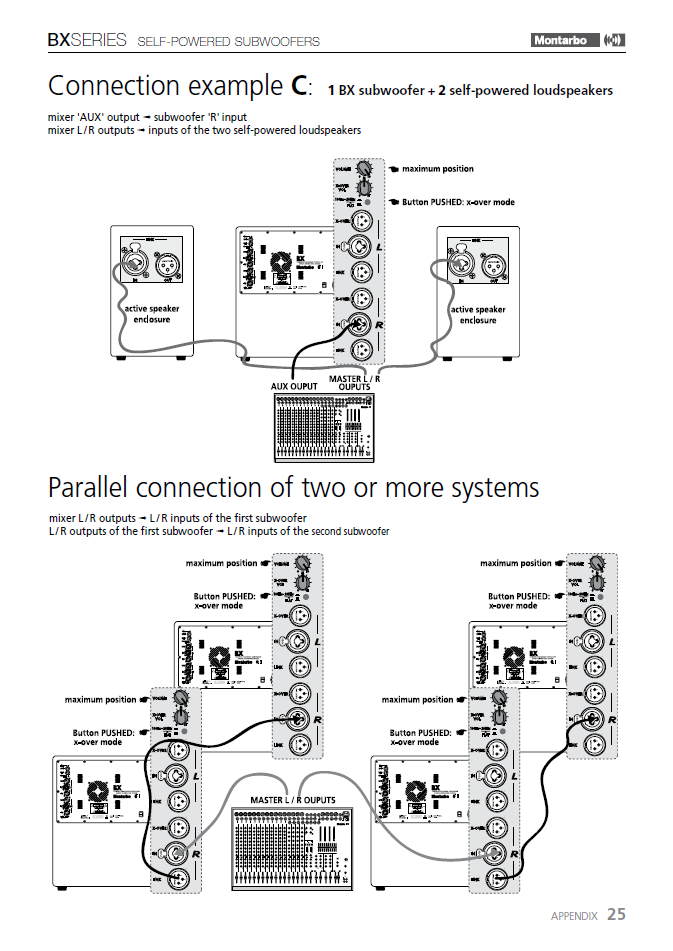 | Connections | X-over stereo input balanced Neutrik Combo® Link output (parallel) balanced XLRs X-over stereo output unbalanced XLRs Mains inlet Neutrik PowerCon® |