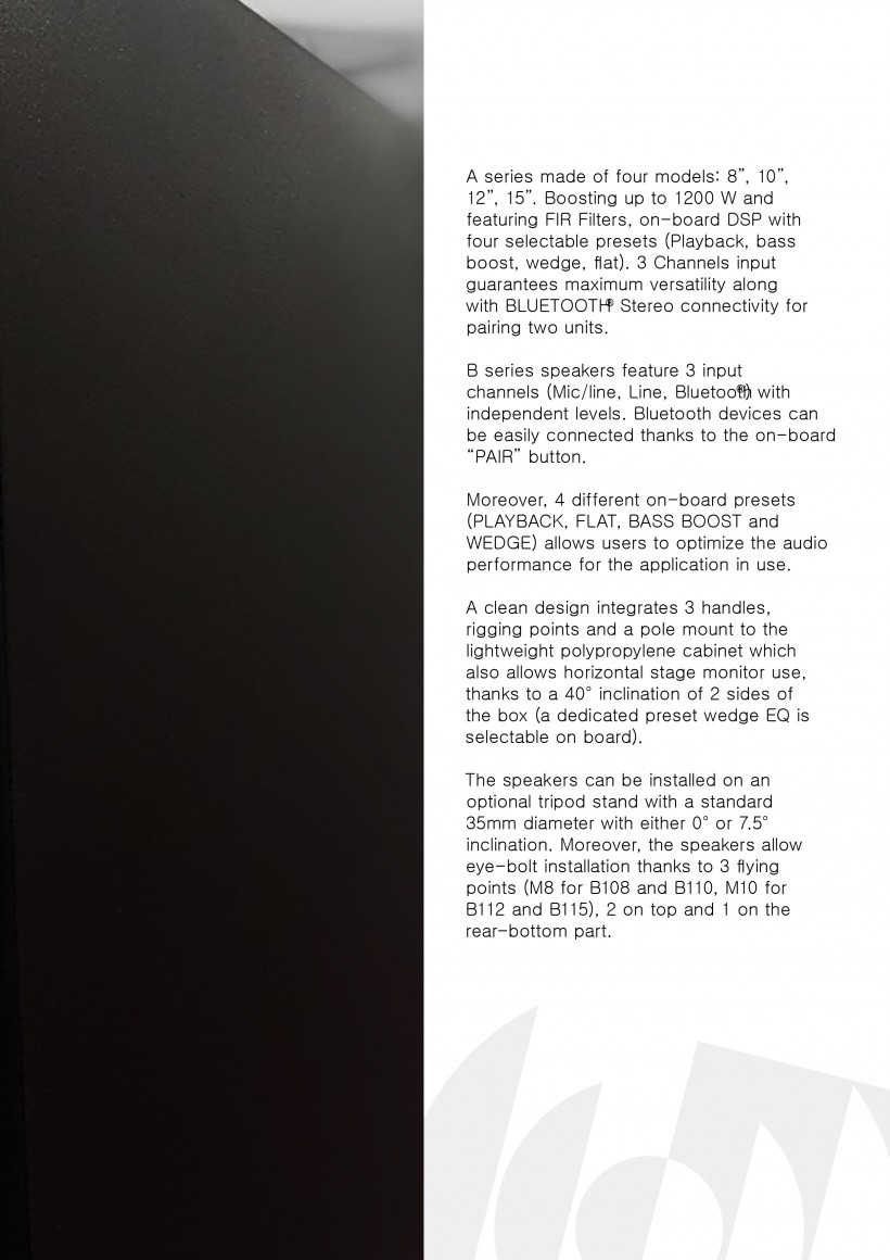 B series speakers feature 3 input channels (Mic/line, Line, Bluetooth) with independent levels. Bluetooth devices can be easily connected thanks to the on-board “PAIR” button.