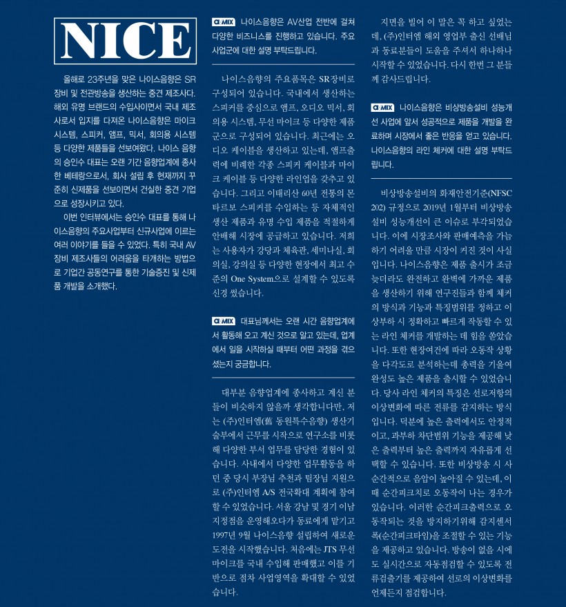 (주)나이스음향정보통신은 영상 및 방송 장비의 수입, 판매 및 공사를 하는 업체로 설립되어 현재에 이르고 있습니다. 1997년 6월에 처음 설립되어 현재 각종 산업체 및 관공서 및 학교,교회에 음향장비를 납품, 공사해오고 있습니다. 대만의 유명브랜드 McLELLAND, MASCOT,Audio Center 이태리브랜드 MONTARBO제품 등 명실상부한 국내 독점 총판으로서 저렴한 가격에 명품브랜드 못지 않은 뛰어난 품질의 제품을 공급해 드리고 있습니다. 현재 서울을 비롯해서 지방 각처에 대리점 및 협력점 네트워크가 구축되어 있으며 짧은 시간에도 불구하고 소비자로부터 탄탄한 신뢰와 명성을 쌓아가고 있습니다. 뛰어난 품질, 철저한 신용과신뢰를 바탕으로 음향업계의 최고가 되고자 전력을 다하고 있습니다. 감사합니다.